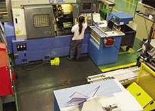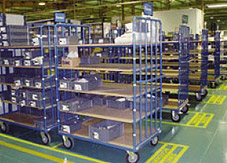 Estanterías con las baldas superiores e inferiores libres de carga Centro de mecanizado con aplicación de 5S. Polos blancos para “control visual” Carros con stock de componentes para una semana de fabricación